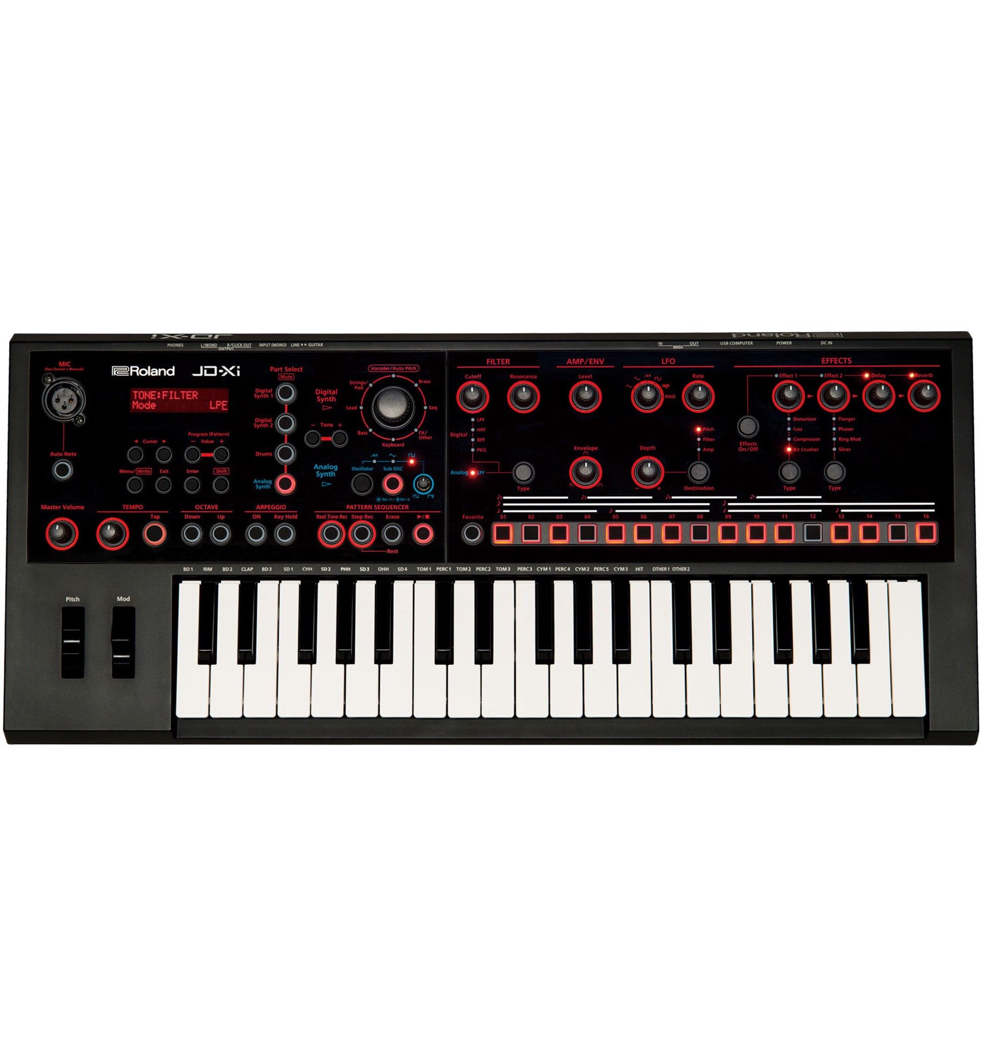 Roland JD-XI được trang bị với 37 phím mini cung cấp tính tròn đầy âm trầm analog bass và dẫn lối các tông với các điều khiển phong phú để tinh chỉnh thực tế, cộng thêm yếu tố PCM đa âm cần thiết như pad, string, brass, và nhiều hơn nữa. Hơn thế nữa Roland JD-XI còn tạo các vòng ấn tượng trong giây lát với pattern sequencer và bộ trống được tích hợp sẵn, cho phép bạn khám phá biểu cảm kết cấu vocal với mic cổ ngỗng, Vocoder, và AutoPitch.